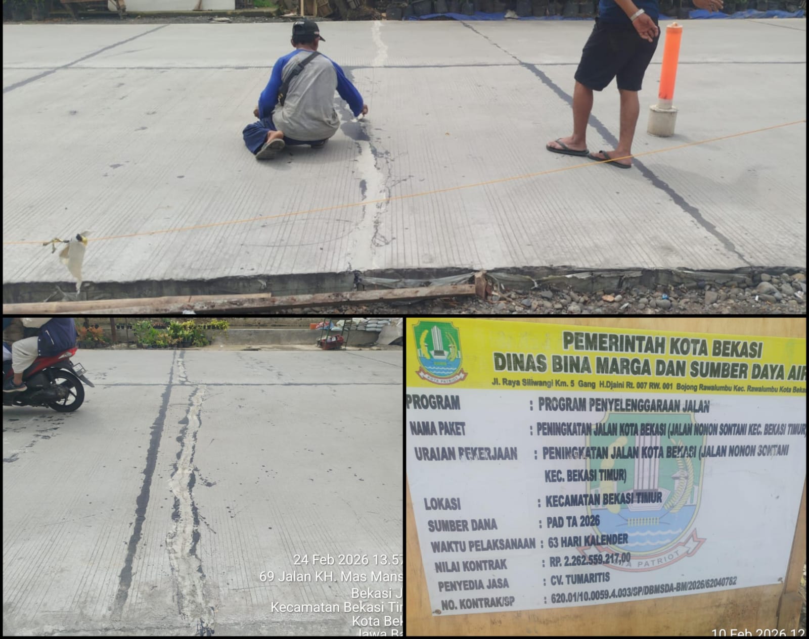 Gansonlinemedia.com, Kota Bekasi – Proyek rekonstruksi jalan di Jalan Nonton Kecamatan Bekasi Timur, kota Bekasi yang dibiayai dari PAD Tahun Anggaran 2026 dengan nilai Rp2.262.559.217, kini menjadi sorotan tajam publik. Jalan yang baru saja selesai dikerjakan tersebut sudah mengalami retakan di sejumlah titik, memunculkan dugaan kuat adanya kegagalan mutu konstruksi sekaligus memantik pertanyaan serius terhadap integritas pelaksanaan proyek dan efektivitas pengawasan teknis.