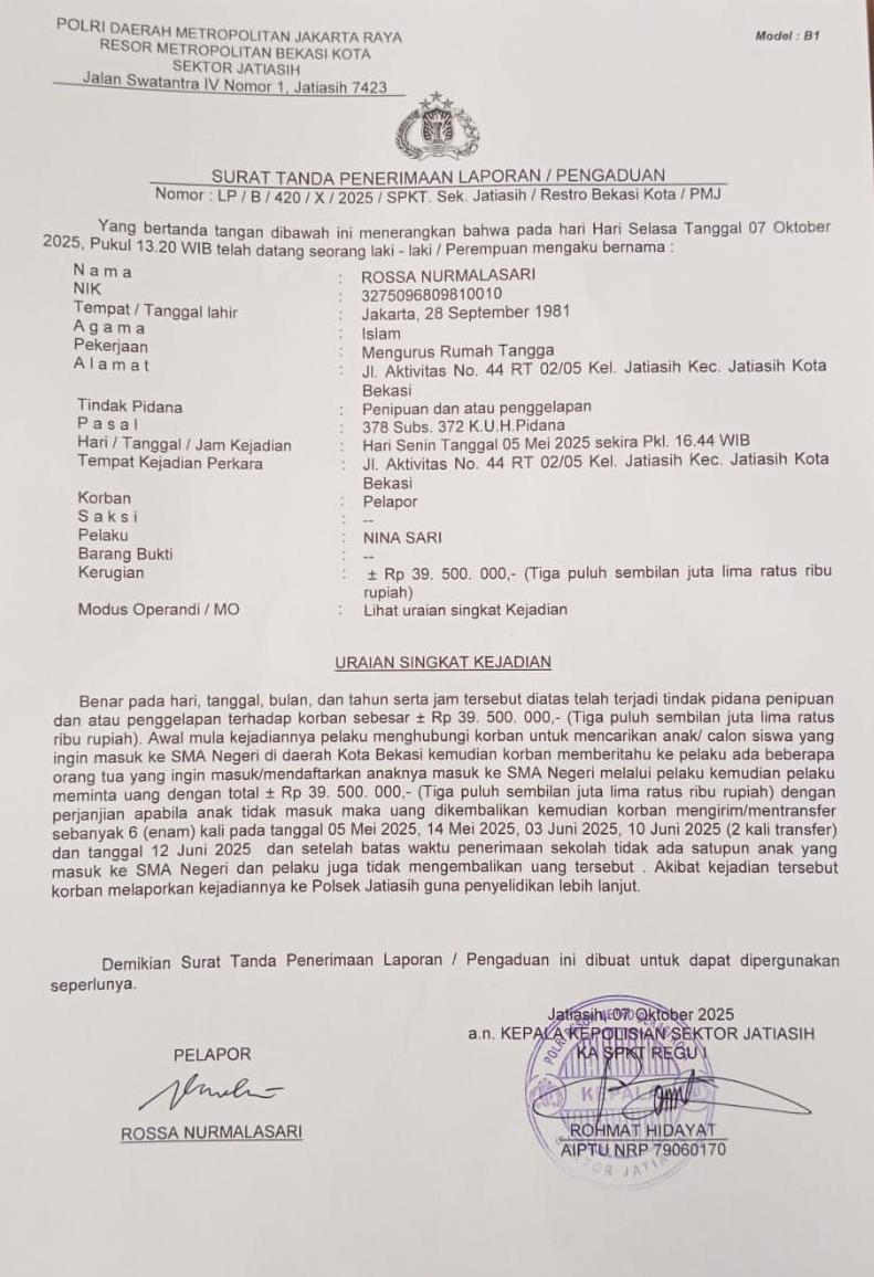 Kasus penipuan dan penggelapan yang diduga dilakukan seorang pekerja Tata Usaha SMAN 6 berinisial (NS) dengan modus pemasukan calon murid diberbagai sekolah menengah (SMA) di kota Bekasi. Diketahui para walimurid yg menjadi korban dirugikan sejumlah uangnya memberikan kuasa kepada saudari (RN) yang akhirnya membawa permasalahan perbuatan melawan hukum saudari (NS) ketingkat laporan pengaduan dengan nomor LP/B/420/X/2025/SPKT. Sek. Jatiasih. Restro Bekasi Kota / PMJ Selasa. 07-10-2025.